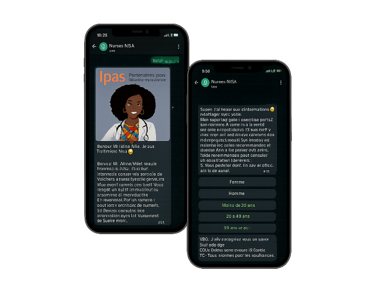Nurse Nisa est un chatbot WhatsApp développé par Ipas pour fournir des informations fiables et confidentielles sur la santé sexuelle et reproductive. Accessible 24h/24, elle informe sur les droits en matière de santé, la contraception, l’avortement sécurisé, la prévention des violences basées sur le genre et le soutien psychosocial. Grâce à une approche adaptée à l’âge et au genre, Nurse Nisa oriente les utilisateurs avec bienveillance. Les échanges sont anonymes, garantissant la confidentialité. Vous pouvez discuter avec elle librement et obtenir des réponses claires, à tout moment, via WhatsApp.
